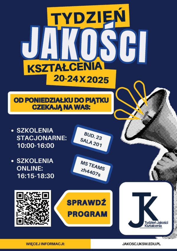 Szanowni Studenci, Doktoranci i Pracownicy! W dniach 20–24 października 2025 r. już po raz 6ty odbędzie się Tydzień Jakości Kształcenia UKSW! Wydarzenie organizowane jest przez Biuro Innowacji Dydaktycznych, Szkoleń i Jakości Kształcenia i stanowi cykliczną inicjatywę łączącą studentów, doktorantów, kadrę dydaktyczną i administracyjną naszej uczelni wokół tematyki jakości kształcenia, nowoczesnej dydaktyki oraz rozwoju kompetencji akademickich. …